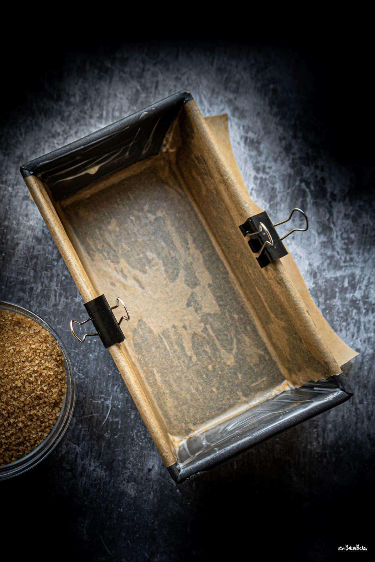 - Grease your loaf tin. Then take a piece of greaseproof (parchment) paper large enough to lay over the long sides and base of your tin (see the picture in main blog post) and place it in the tin.
